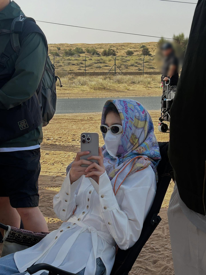 넓은 사막을 배경으로 촬영에 임하는 모습도 포착됐다. 두건과 마스크, 선글라스로 얼굴을 가린 채 휴대폰을 들고 있는 모습은 웃음을 자아내게 한다.