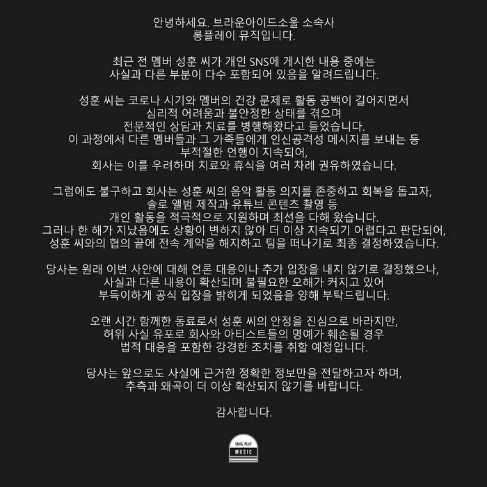 롱플레이 뮤직은 7일 공식 입장을 통해 “최근 전 멤버 성훈 씨가 개인 SNS에 게시한 내용 중에는 사실과 다른 부분이 다수 포함되어 있음을 알려드린다”고 운을 뗐다.
