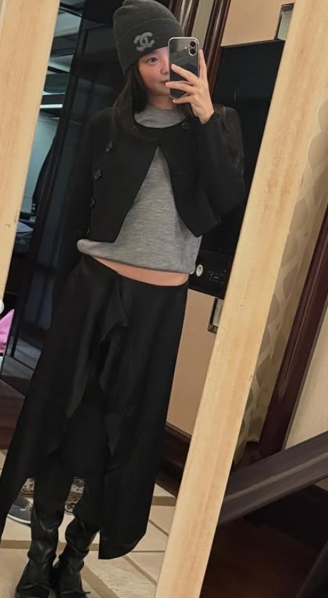 거울 앞에서는 짧은 크롭 재킷과 니트 비니를 더해 룩의 무드를 변주했다.