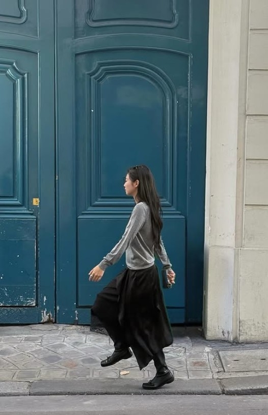 회색 니트와 블랙 롱 스커트, 블랙 슈즈의 간결한 조합으로 파리 도심을 걸었다.