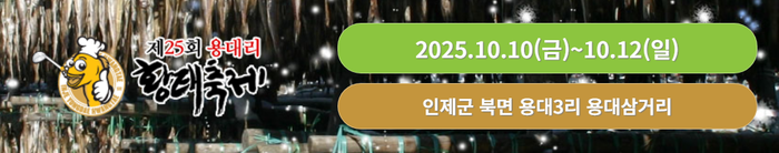 추석 연휴가 끝나는 10일부터 12일까지 북면 용대리에서는 ‘제25회 용대리 황태축제’가 열린다. ‘황태와 국화, 오감으로 즐기는 가을 여행’을 주제로 개회식, 산신제, 황태 요리체험, 황태즉석노래자랑, 황태장터 운영 등 인제 대표 특산물이 황태를 다양한 방식으로 즐길 수 있다.