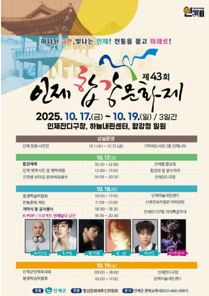 이어 17일부터 19일까지는 인제읍 일원에서 인제군 대표 향토문화축제인 ‘제43회 합강문화제’가 열린다. 17일 합강제례와 고사음식 체험을 시작으로 인제 뗏목시연, 전통혼례 재현, 축하공연, 군민 체육대회 등 풍성한 프로그램이 마련된다. 특히 이번 합강문화제는 제11회 인제군 평생학습박람회, 군장병 한마음 문화‧체육행사와 연계해 더욱 다채롭게 진행된다.