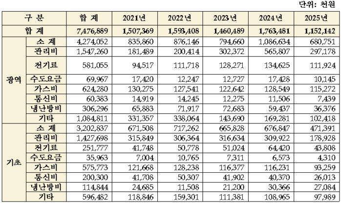 최근 5년간 전국 170개 지자체가 △관리비 29억 7천만원 △가스비 12억원 △전기료 8억 3천만원 △냉난방비 4억 2천만원 △통신비 2억 6천만원 △수도요금 1억원을 세금으로 충당했다. 유지관리비 역시 △리모델링 등 공사 108억 9천만원 △유지관리 54억 2천만원 △자산취득 25억 6천만원 △소모품 구입 5억 5천만원이 지출됐다.