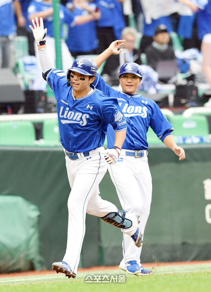 삼성 김영웅(왼쪽)이 9일 인천 SSG랜더스필드에서 열린 2025 KBO리그 SSG와의 준플레이오프 1차전 3회초 무사 1루 상황에서 SSG 선발 화이트를 상대로 2점 홈런을 치고 이종욱 코치와 하이파이브를 하고 있다. 2025. 10. 9.