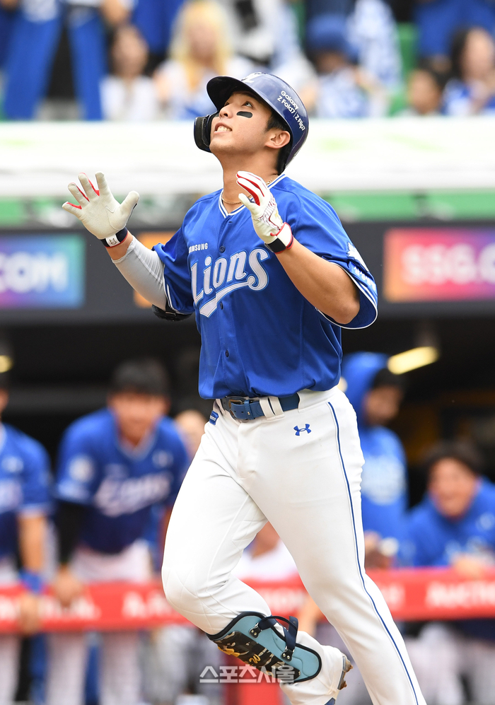 삼성 김영웅이 9일 인천 SSG랜더스필드에서 열린 2025 KBO리그 SSG와의 준플레이오프 1차전 3회초 무사 1루 상황에서 SSG 선발 화이트를 상대로 2점 홈런을 치고 세리머니를 하고 있다. 2025. 10. 9.