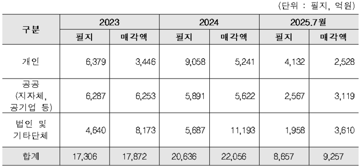 현재 국유재산법은 원칙적으로 국유재산 처분 시 그 뜻을 공고하여 일반경쟁에 부치도록 하고 있다. 지난해 국유재산 매각 필지 중 43.9%인 9,058필지는 개인이 매수한 것으로 드러났다.