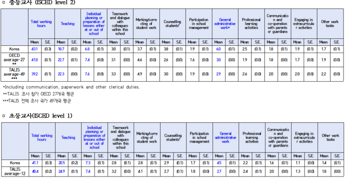초등교사의 경우도 상황은 다르지 않았다. 우리나라 전임 초등교원의 주당 총 근무시간은 41.1시간으로 전체 조사국 평균(40.4시간)보다 0.7시간 많았고, 수업 시간은 20.5시간으로 평균보다 4.4시간 적었다. 반면, 행정업무 시간은 4.5시간으로 전체 평균 대비 1.8시간 많아, 일본과 함께 최상위 수준으로 나타났다.