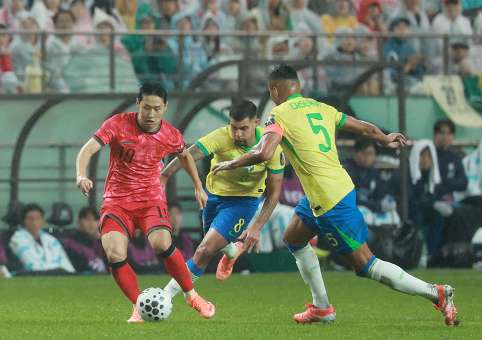 한국은 브라질을 상대로 고전했다. 수비부터 라인을 높이 올려 공격적으로 경기를 운영한 브라질의 공세에 밀렸다. 공격수들이 공을 만질 기회가 많지 않았다.