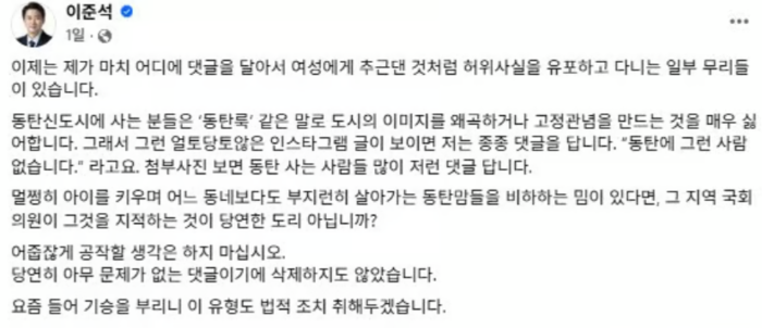 이준석 대표는 9일 자신의 SNS를 통해 “제가 여성에게 추근댄 것처럼 허위사실을 유포하는 일부 무리들이 있다”며 즉각 해명에 나섰다. 그는 “동탄 주민들은 ‘OO룩’처럼 지역의 이미지를 왜곡하는 표현을 싫어한다”며 “그래서 그런 게시물이 보이면 ‘동탄에 그런 사람 없습니다’라는 댓글을 단다. 이는 지역 비하를 막기 위한 행동”이라고 설명했다. 이어 “어쭙잖은 공작은 하지 말라. 아무 문제가 없는 댓글이라 삭제하지 않았다. 악의적 유포에 법적 조치를 취하겠다”고 강경한 입장을 밝혔다.