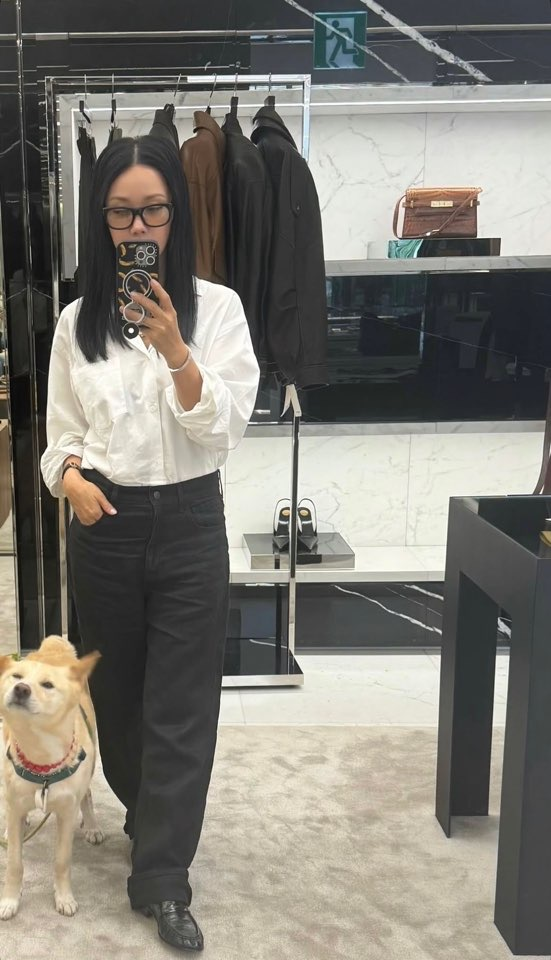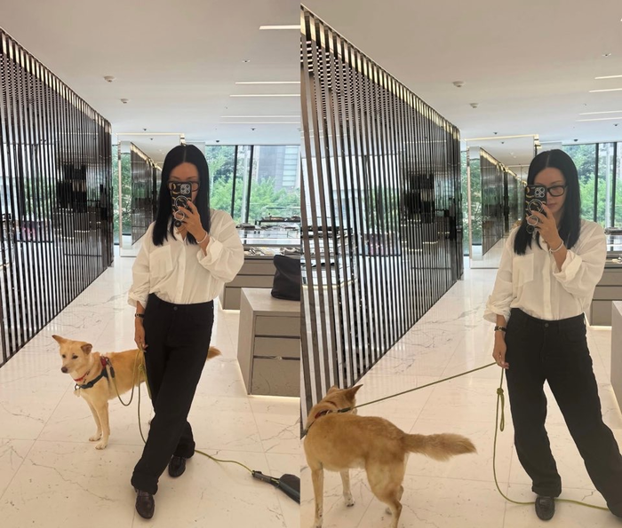 사진 속 엄정화는 단정하게 다운된 핏의 화이트 셔츠에 여유 있는 블랙 팬츠를 받쳐 입고 반려견과 함께 포즈를 취했다. 특별한 컬러감 하나 없이 흰색과 검은색만 어우러진 ‘모나미룩’ 스타일링에도, 은은한 카리스마가 느껴지는 실루엣이 인상적이다. 시크한 생머리의 매력까지 더해지면서 ‘꾸안꾸’의 정석이 무엇인지 그대로 보여준다.