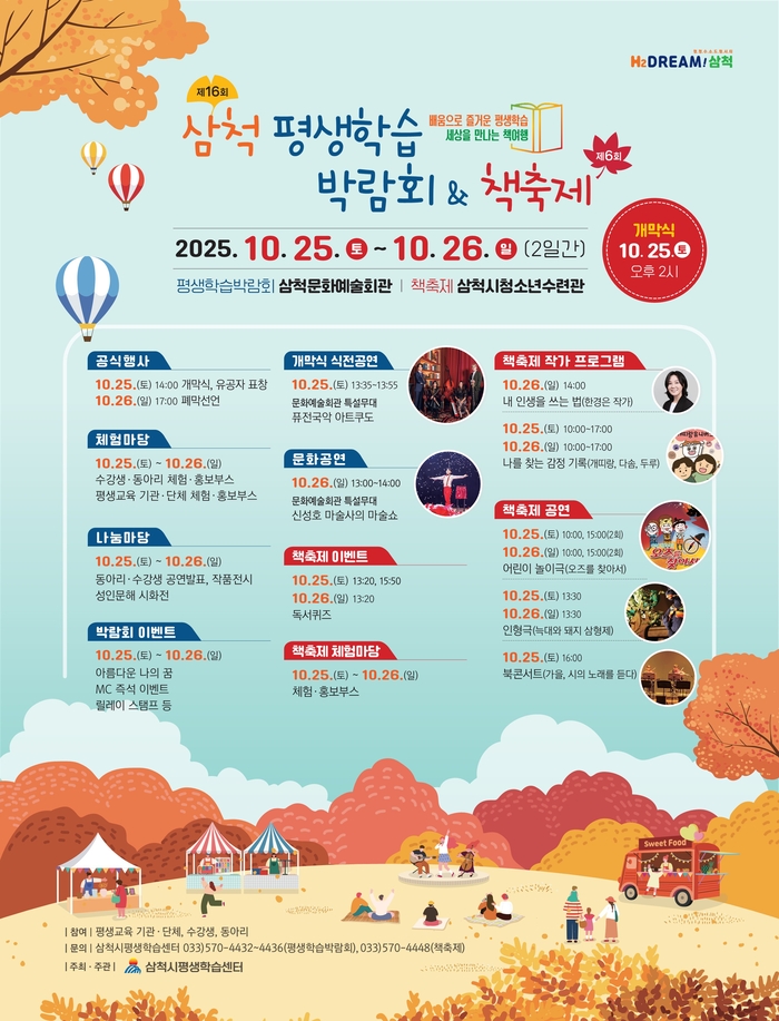 [스포츠서울ㅣ김기원기자]삼척시는 오는 10월 25일부터 26일까지 이틀간 삼척문화예술회관과 삼척시청소년수련관 일원에서 ‘제16회 삼척평생학습박람회 및 제6회 책축제’를 개최한다.
