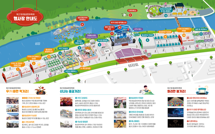 또 하나의 주목할 점은 새롭게 시도되는 신규 콘텐츠들이다. 새롭게 리뉴얼한 한우리 캐릭터를 활용해 한우리 오브제 테마존으로 운영되며 다양한 컬러감과 최신 트랜드에 맞는 전시, 굿즈샾 등 복합 아트팝업존으로 구성되는 ‘한우리팝업스토어’와 토속적인 전통 민속마을 컨셉으로 전문 배우 NPC 운영을 통한 참여형 민속체험마을인 ‘한우리민속마을’, 섬강변과 용바위를 활용한 수변경관조경으로 수백개의 조명배가 섬강을 수놓는 형태의 ‘섬상판타지아 라이트쇼’가 큰 호응을 받을 것으로 기대된다.
