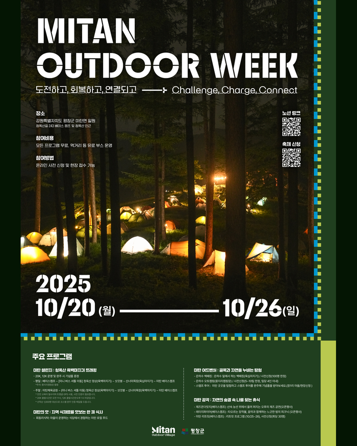 이번 행사는 2025년 행정안전부「생활권 단위 로컬 브랜딩 활성화 사업」 공모에 선정된 ‘미탄 아웃도어 빌리지-로드트립 & 트레킹 거점마을’ 사업의 하나로, ‘도전하고, 회복하고, 연결되고 →Challenge, Charge, Connect’라는 주제 아래 진행된다.