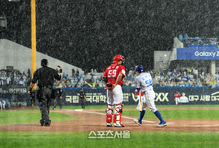 13일 대구 삼성라이온즈파크에서 열리는 2025 KBO리그 SSG와 삼성의 준플레이오프 3차전 1회말 구심이 비로 인한 경기 중단을 선언하고 있다. 2025. 10. 13.