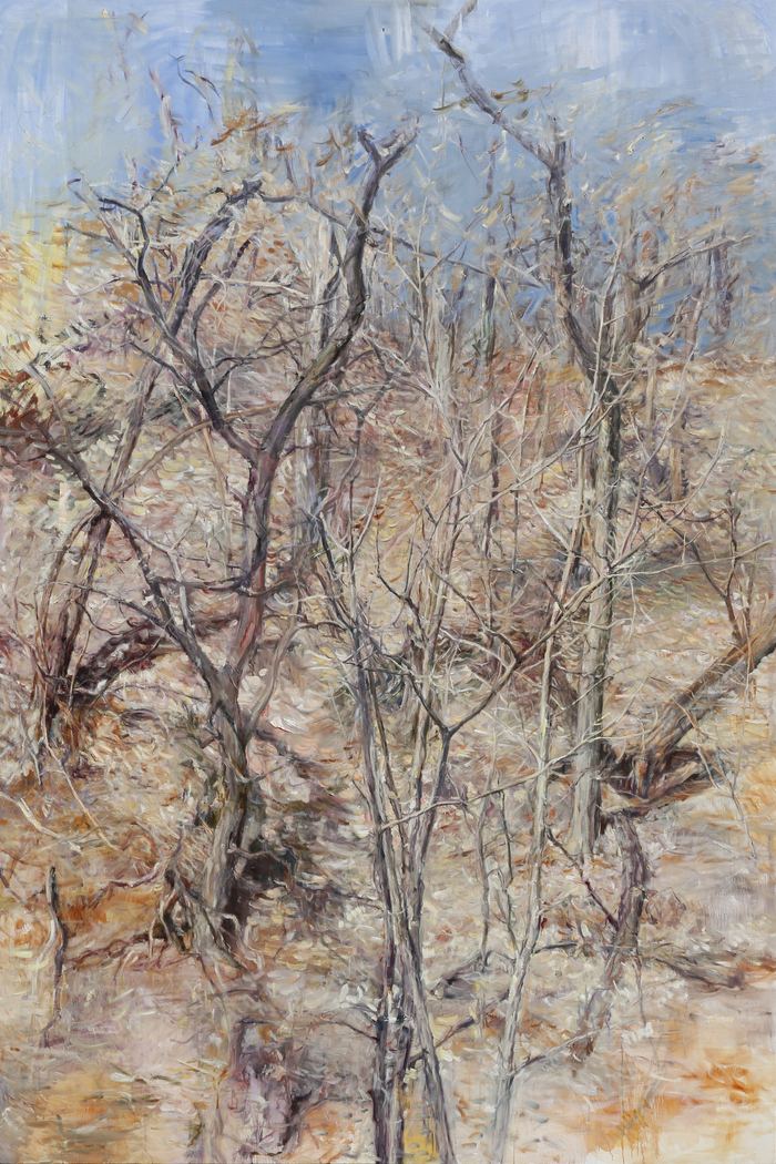 세상은 고정시킬 수 없고 생성 중이며 운동 중이다. 작가는 나무의 살아있는 상태와 힘의 동세, 생성 중인 시간을 그리고자 한다. 수시로 떨어대는 세계를 고정된 화면 안에 온전히 응고시킬 수 없기에, 그는 그 흐름과 운동, 기운을 더듬어 다시 보여준다.