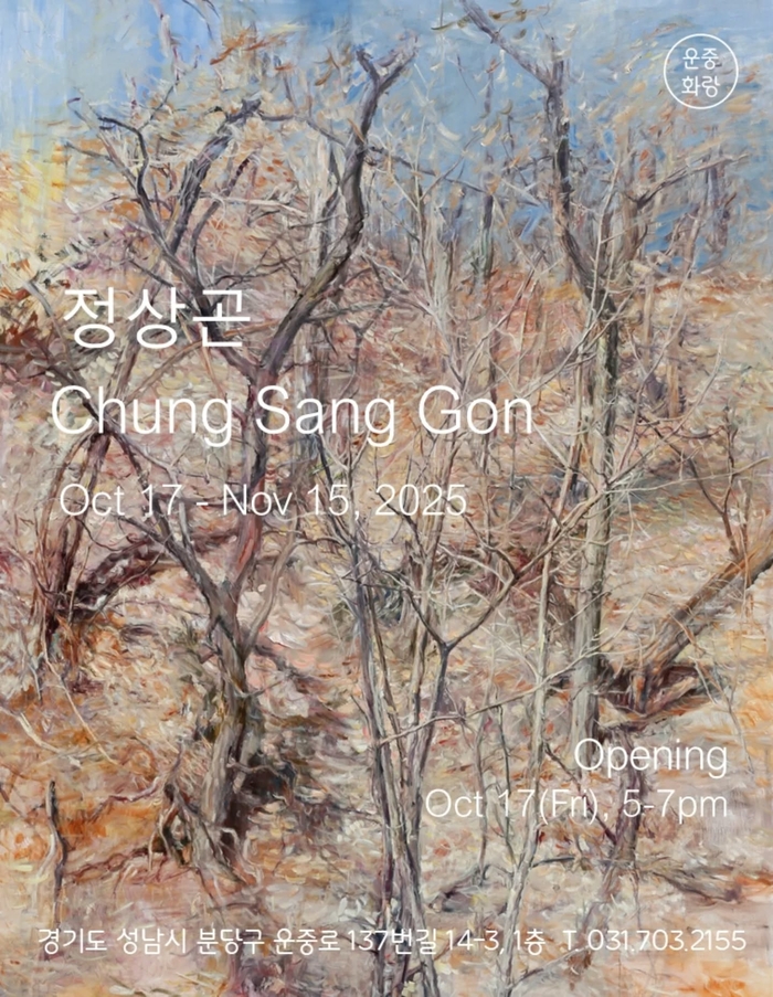 정상곤 개인전 ‘찬란한 그러면서 허망한(Radiant Yet Ephemeral)’은 경기도 성남시 분당구 운중화랑에서 10월 17일부터 11월 15일까지 열린다. 관람 시간은 화요일부터 토요일 오전 10시부터 오후 6시까지이며, 일요일과 월요일, 공휴일은 휴관한다. 오프닝 리셉션은 10월 17일 오후 5시부터 7시까지 진행된다.