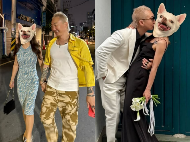 신부의 얼굴은 귀여운 ‘개 마스크’ 이미지로 가려 비연예인 신분을 배려했고, 드레스 라인에 살짝 드러난 타투가 개성 있는 포인트를 더했다.