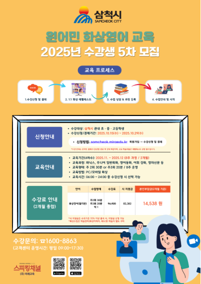[스포츠서울ㅣ김기원기자]삼척시는 청소년들의 영어 의사소통 능력과 학습 자신감을 높이기 위한 청소년 대상 원어민 화상영어 지원사업의 5기 수강생을 10월 15일부터 10월 29일까지 모집한다.