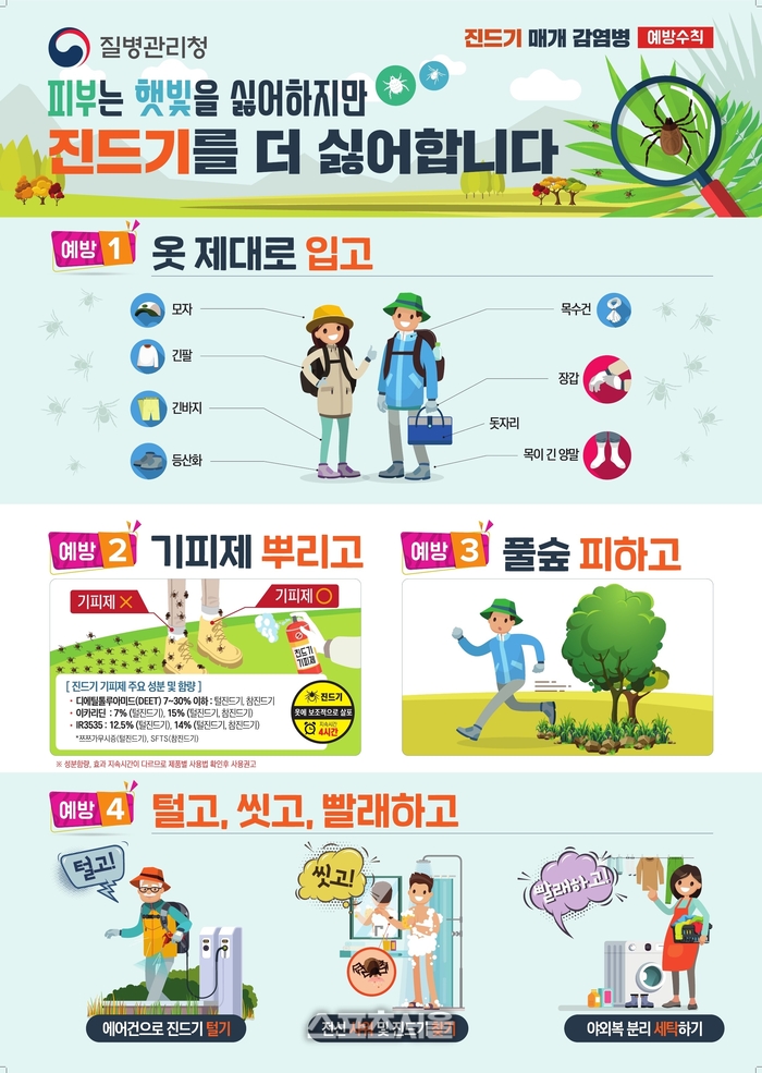 진드기 매개 감염병 예방을 위해서는 ▲야외 활동 시 진드기 기피제 사용 및 긴소매·긴바지·모자 등 착용으로 피부 노출 최소화 ▲야외활동 후 즉시 샤워 및 옷 갈아입기 ▲얼굴, 귀, 몸통 등에 진드기 부착 여부 확인 등의 수칙을 지켜야 한다.