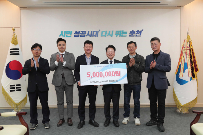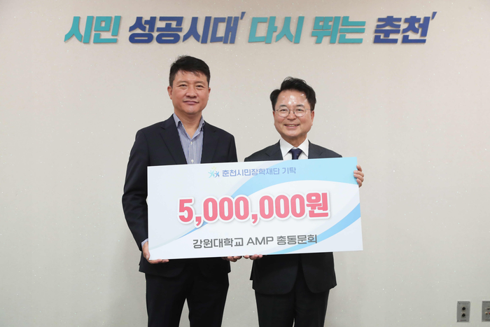 [스포츠서울ㅣ춘천=김기원기자]강원대 AMP 총동문회(회장 신대호)는 지난 13일 춘천시청 접견실에서 500만 원의 장학금을 (재)춘천시민장학재단(이사장 육동한 춘천시장)에 기탁했다. 이번 기탁은 지역 인재 육성과 교육 발전을 위한 뜻을 모은 것으로 기탁자와 시·재단 관계자들이 함께한 가운데 진행됐다.
