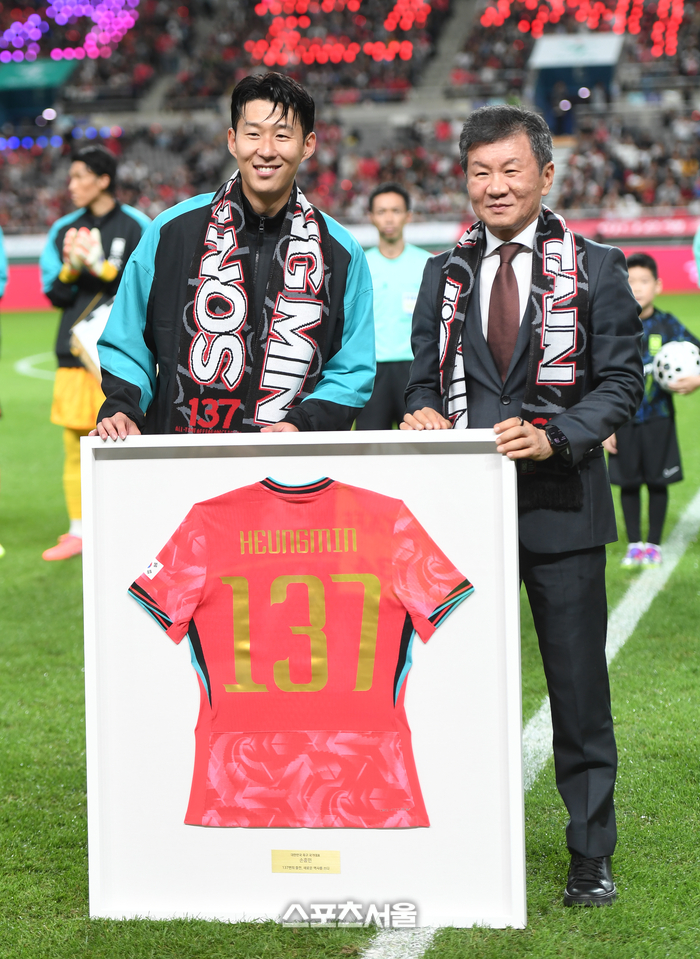 손흥민이 14일 서울월드컵경기장에서 열린 남자 축구 국가대표 평가전 파라과이와 경기 전 137경기 A매치 최다 출전 기념식에서 정몽규 회장과 기념촬영을 하고 있다.