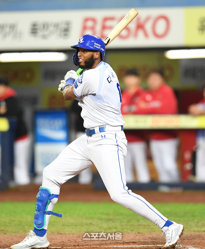 삼성 디아즈가 14일 대구 삼성라이온즈파크에서 열린 2025 KBO리그 SSG와의 준플레이오프 4차전 6회말 무사 1-2루 상황에서 SSG 투수 노경은을 상댈 1타점 적시타를 치고 있다. 2025. 10. 14.