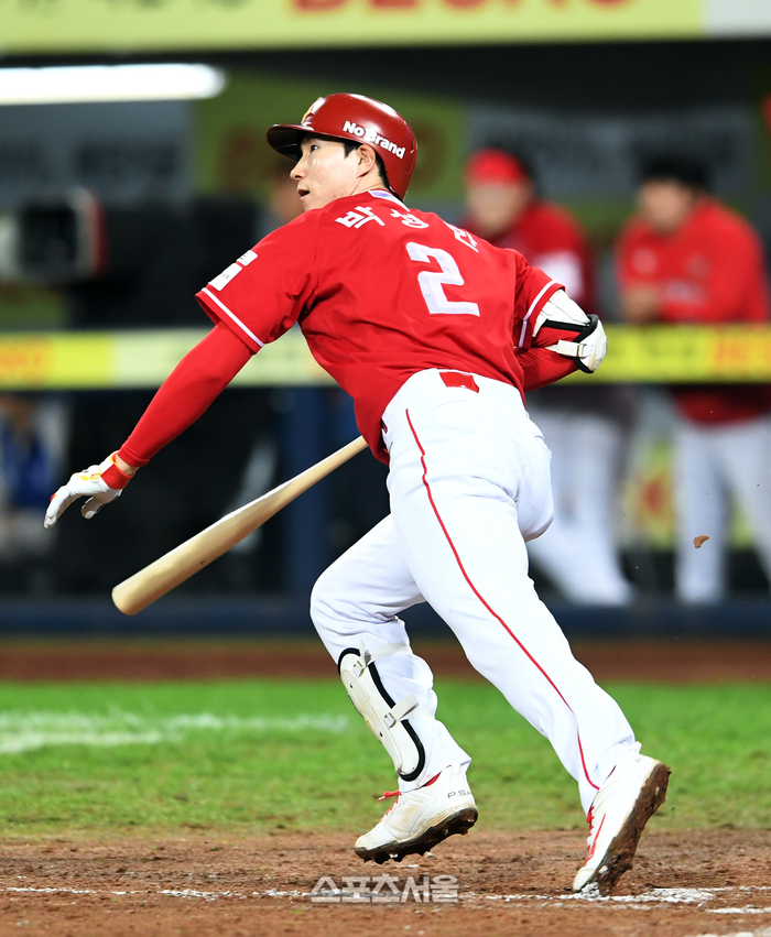 SSG 박성한이 14일 대구 삼성라이온즈파크에서 열린 2025 KBO리그 삼성과의 준플레이오프 4차전 8회초 무사 1-3루 상황에서 삼성 투수 이승현을 상대로 2타점 2루타를 치고 있다. 2025. 10. 14.