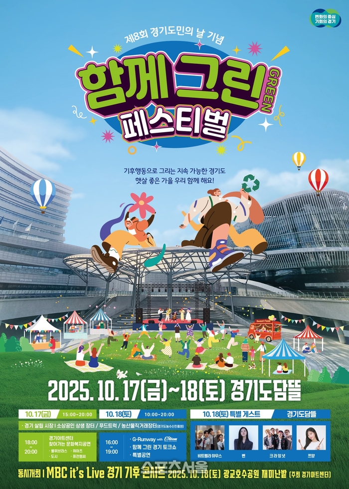 이어지는 ‘함께 그린 경기 토크쇼’에서는 김동연 지사와 도민이 함께하는 대화, 정책 퀴즈쇼 등 참여형 프로그램이 진행된다. 배우 박시은·진태현 부부가 사회를 맡으며, 신규 홍보대사인 유튜버 쯔양과 음악그룹 비트펠라하우스의 위촉식도 이뤄진다. 축하 공연으로는 가수 벤, 크라잉넛, 비트펠라하우스의 무대가 준비돼 있다.