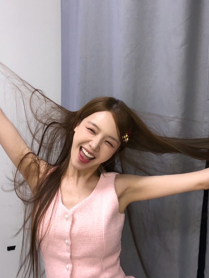 공개된 사진 속 민아는 핑크빛 원피스를 입고 환한 미소를 짓고 있다. 긴 생머리를 양옆으로 펼치며 장난스럽게 웃는 모습은 사랑스러움 그 자체다.