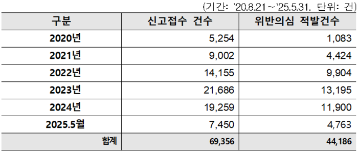특히 23년도부터는 연간 위반 의심 적발 건수가 1만 건을 상회하고 있으며, 올해도 5월까지 이미 4763건이 적발돼 올해 역시 1만 건을 넘어설 것으로 전망된다.