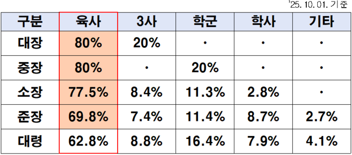 국방부가 김병기 의원실에 제출한 자료에 따르면 2025년 10월 1일 현재 우리나라 육군 대령 중 62.8%가 육군사관학교 출신인 것으로 나타났다.