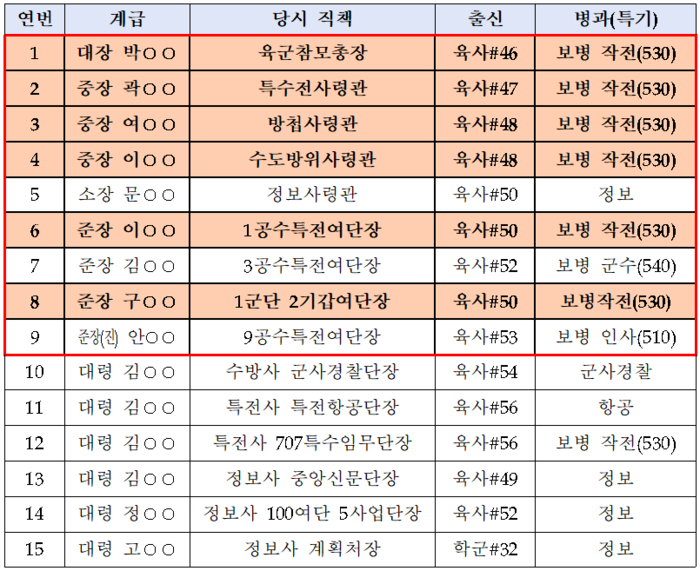 내란 수사 대상 장성 9명 전원 육사 출신 그중 6명 보병 작전 특기, 군 인사 편향 심각