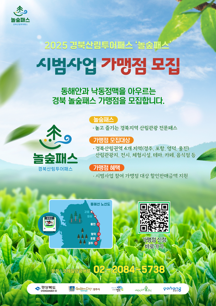 [스포츠서울 | 윤새봄 기자] 코레일관광개발이 경상북도, 포항시, 경주시, 영덕군, 울진군과 함께 동해중부선 개통에 따른 ‘낙동정맥 숲여행 사업’의 일환으로, ‘경북산림투어패스’ 사업 가맹점을 오는 31일까지 모집한다.