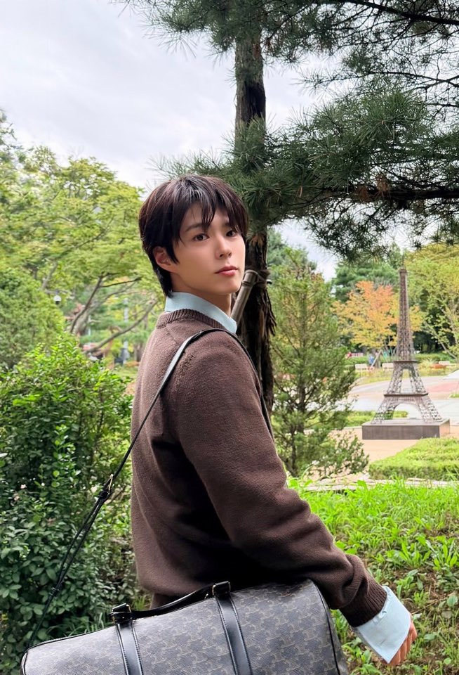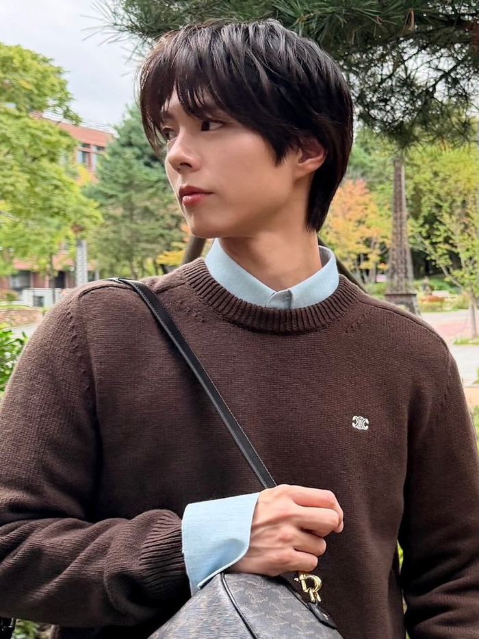 브라운 컬러의 니트 속 시원한 하늘색 셔츠 레이어드 또한 돋보였다. 이에 브랜드 로고가 빼곡히 새겨진 명품 가방을 멨음에도 그의 화려한 미모는 전혀 묻히지 않았다.