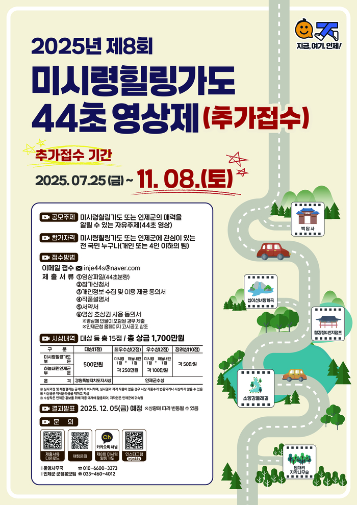이번 공모전은 대한민국 국민 누구나 참여할 수 있으며, 공모 주제는 미시령힐링가도 또는 인제군의 매력을 담은 자유 주제다. 영상 길이는 국도 번호에 착안해 44초로 제한되며, 길이를 초과하거나 미달할 경우 1초당 5점의 감점이 적용된다.