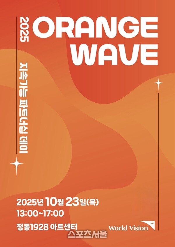 [스포츠서울 | 백승관 기자] 국제구호개발 NGO 월드비전(회장 조명환이 오는 10월 23일 서울 정동1928 아트센터에서 ‘2025 오렌지웨이브(Orange Wave) 지속가능 파트너십 데이’를 개최한다. 기업의 ESG(환경·사회·지배구조) 경영 실천을 위한 협력의 새로운 모델을 제시하고, 지속가능한 사회공헌 생태계 조성을 목표로 마련됐다.