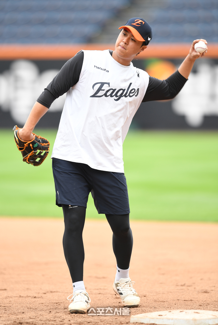 한화 권광민이 17일 대전 한화생명볼파크에서 열리는 2025 KBO 포스트시즌 플레이오프 1차전 삼성과 경기 전 훈련을 하고 있다.