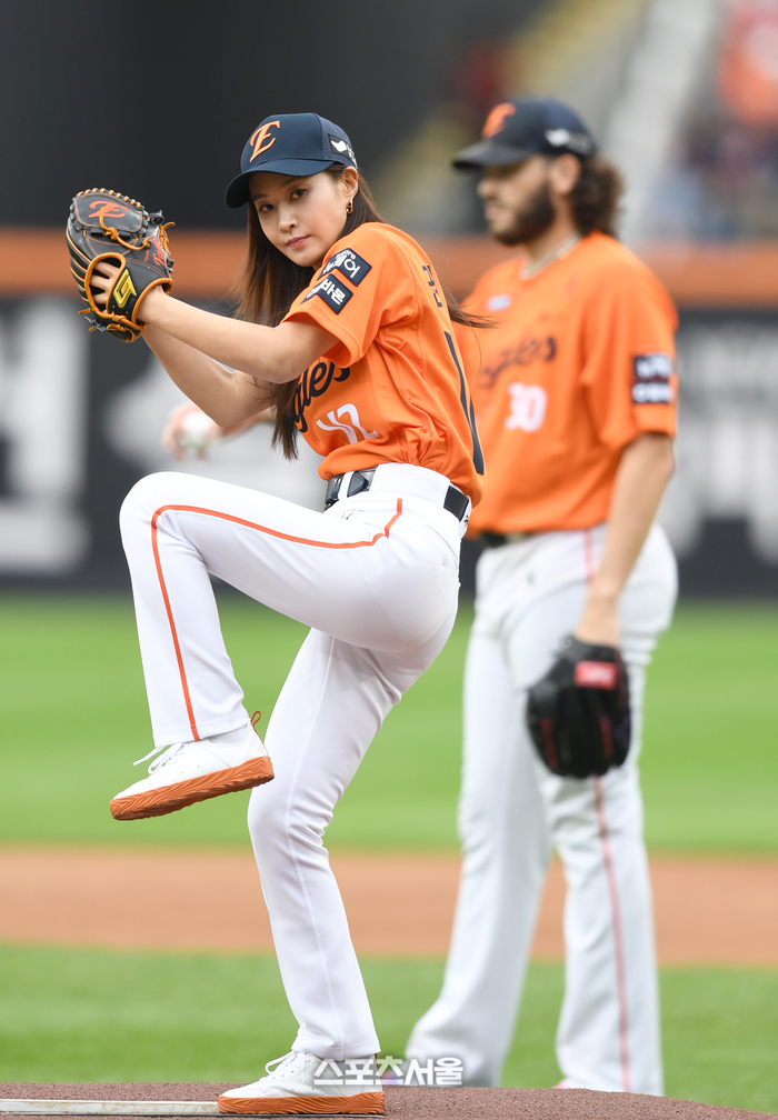 소녀시대 유리가 18일 대전 한화생명볼파크에서 열린 2025 KBO 포스트시즌 플레이오프 1차전 삼성과 경기에서 시구를 하고 있다.
