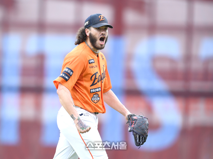 한화 선발투수 폰세가 18일 대전 한화생명볼파크에서 열린 2025 KBO 포스트시즌 플레이오프 1차전 삼성과 경기 1회초 2사 상대 구자욱을 삼진처리 후 환호하고 있다.
