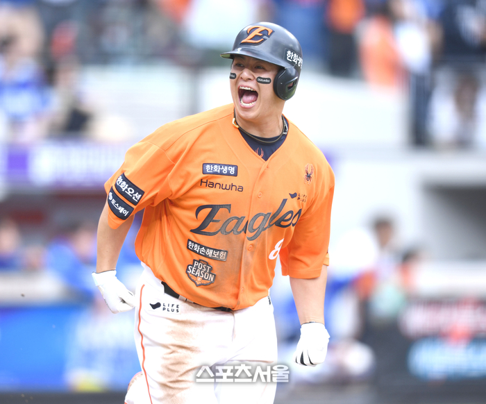 한화 노시환이 18일 대전 한화생명볼파크에서 열린 2025 KBO 포스트시즌 플레이오프 1차전 삼성과 경기 2회말 2사3루 1타점 좌전안타를 친 후 환호하고 있다.