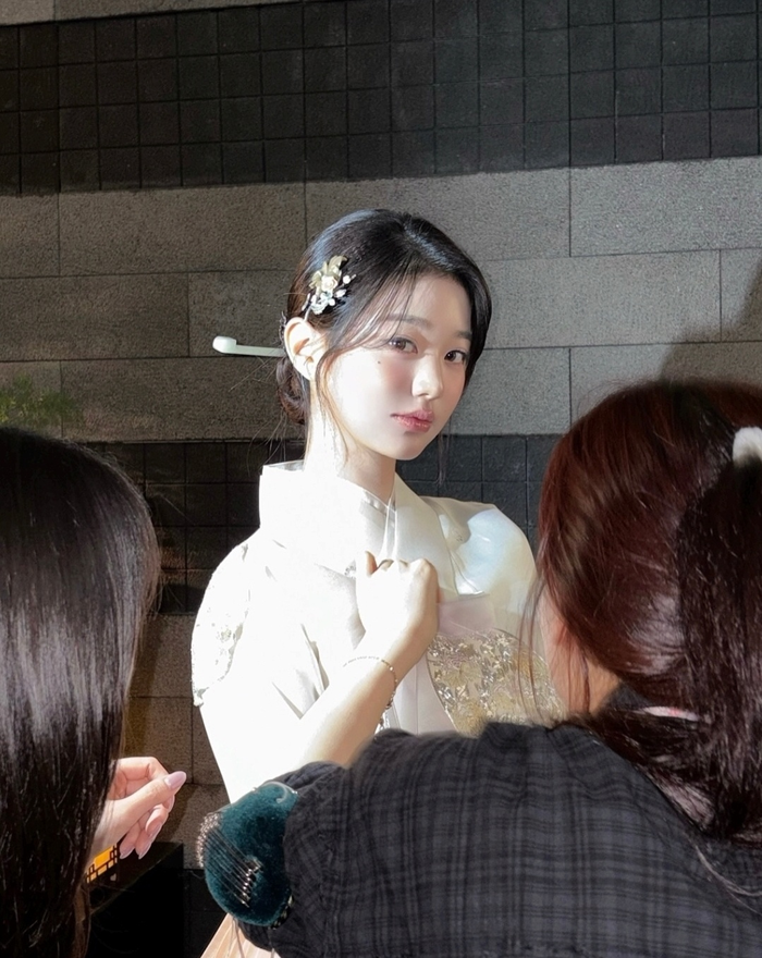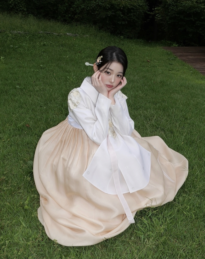 공개된 사진 속 장원영은 흰색 저고리와 살구색 치마로 이루어진 한복을 곱게 차려입은 채 단아한 매력을 발산했다. 머리에는 섬세한 비녀와 머리핀을 더해 우아함을 완성했다.