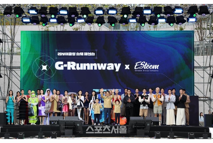 1부 행사 ‘지-런웨이(G-Runway)’에서는 김동연 지사가 특별한 옷을 입고 무대에서 어린이 모델 2명과 함께 패션쇼 워킹을 했다. 김 지사가 입은 재킷은 소방관이 입었던 방화복을 업사이클(재활용)한 옷으로, 기후행동(Save Life, Save Earth) 메시지를 담았다.
