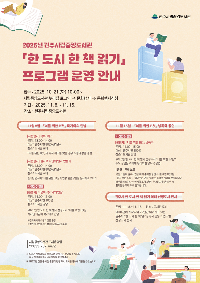 참가 신청은 10월 21일 오전 10시부터 도서관 누리집에서 접수한다. 자세한 사항은 시립중앙도서관 도서운영팀(☎033-737-4472)으로 문의하면 된다.