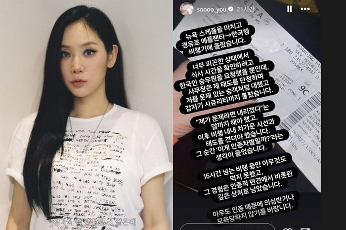 소유는 19일 SNS에 “뉴욕 스케줄을 마치고 애틀랜타 경유 후 한국행 비행기에 올랐다. 너무 피곤해 식사 시간을 확인하려고 한국인 승무원을 요청했을 뿐인데 사무장이 내 태도를 단정하며 문제 있는 승객처럼 대했고 갑자기 시큐리티까지 불렀다”고 적었다.