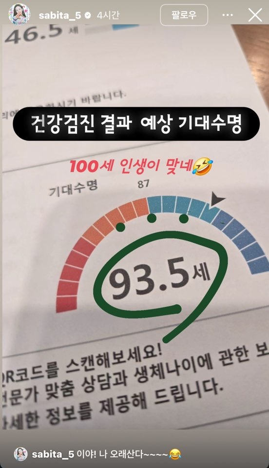 오나라는 오늘(20일) 자신의 인스타그램에 건강검진 결과지를 찍은 사진을 게시했다. “건강검진 결과 예상 기대수명”이라는 설명과 함께 공개된 사진 속 그의 기대수명은 무려 93.5세. 놀라운 수치에 네티즌들은 물론 본인도 깜짝 놀란 모습이었다.