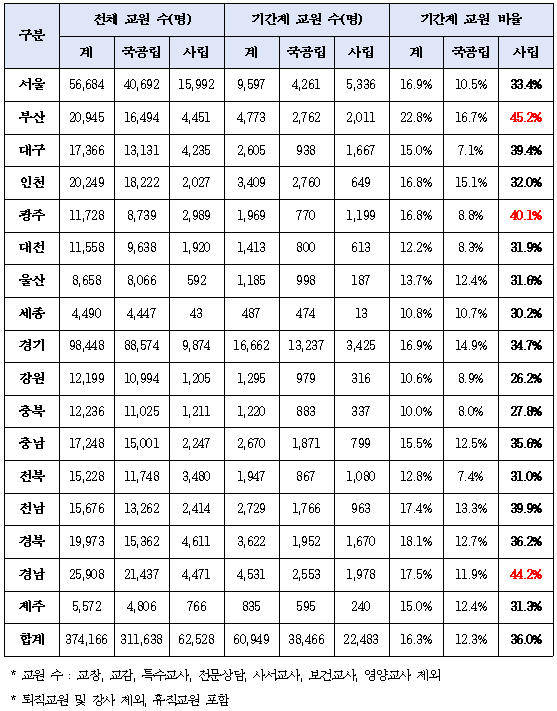 반면 전체 기간제 교원 비율은 16.3%(37만 4166명 중 6만 949명), 국·공립학교 기간제 교원 비율은 12.3%(31만 1638명 중 3만 8466명)에 불과했다. 국·공립학교 기간제 교원 비율에 비해 사립학교 기간제 교원 비율이 3배가량 높은 것이다.