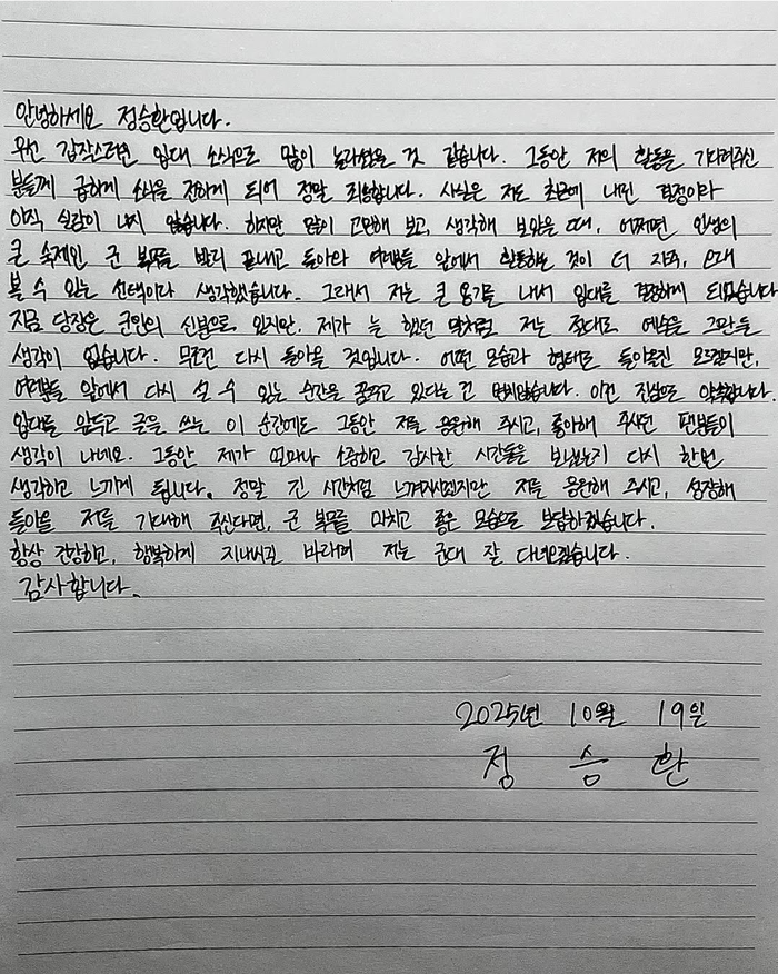 입대 전 정승환은 팬들에게 직접 편지를 남겼다. 정승환은 “갑작스러운 소식으로 많이 놀라셨을 것 같다. 급하게 전하게 돼 정말 죄송하다”며 “많이 고민한 끝에 인생의 큰 숙제인 군 복무를 빨리 마치고 돌아오는 것이 더 자주, 오래 팬분들을 만날 수 있는 선택이라 생각했다”고 전했다.
