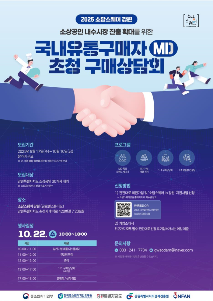 [스포츠서울ㅣ춘천=김기원기자]강원특별자치도(도지사 김진태)와 강원특별자치도경제진흥원은 10월 22일(수), 「소담스퀘어 인(in) 강원」에서 도내 소상공인을 대상으로 ‘2025 소담스퀘어 강원 엠디(MD)초청 구매상담회’를 개최한다.