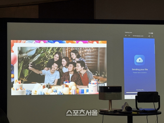 ‘엡손 스튜디오 프로젝션 앱’은 프로젝터와 호환해 실시간 공유 가능한 엔터테인먼트 콘텐츠다. 호스트뿐 아니라 게스트와 즐기는 장치로 확장, 사진·영상 등을 프로젝터에 연결하는 방식이다.