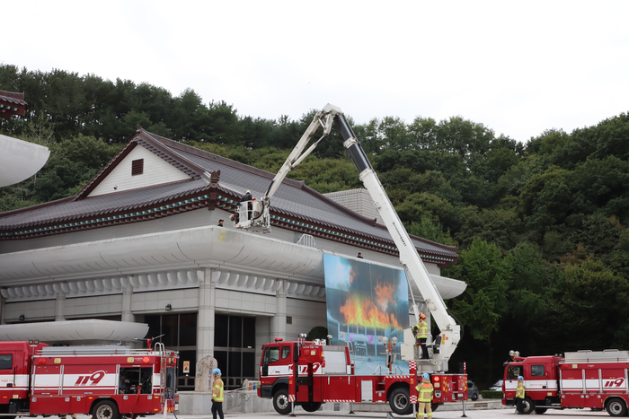 이번 훈련은 지하 1층 보일러실 유증기 폭발로 인한 건물 붕괴 및 대형화재 발생을 가정해, 공연장 내 다수 사상자 구조 및 인접 산림 확산 대응까지 포함한 실전형 복합재난 시나리오로 진행됐다.